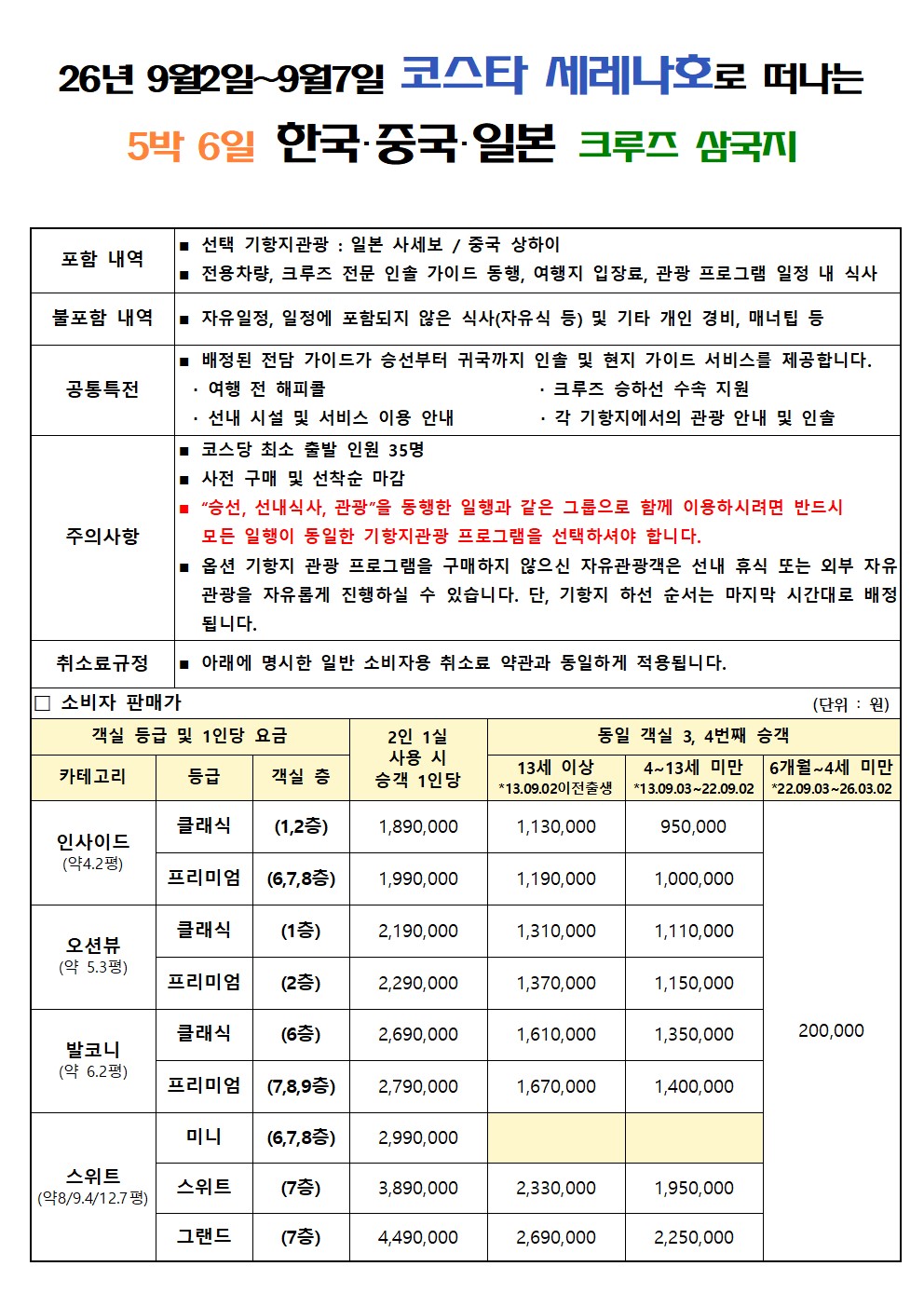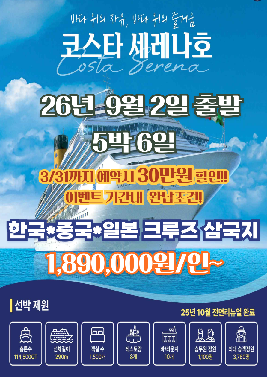 26년9월2일~9월7일 🛳️코스타 세레나호로 떠나는