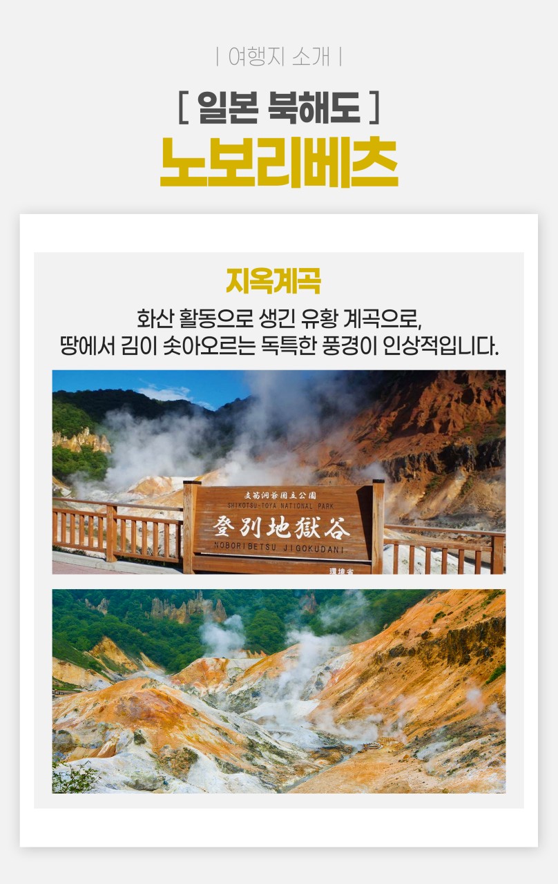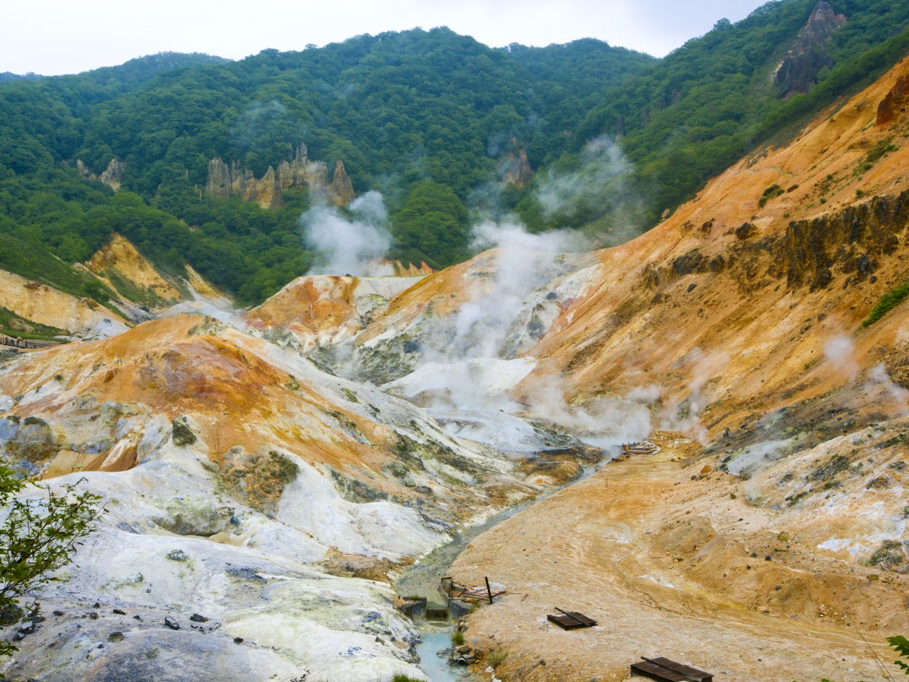 노보리베츠는 홋카이도 최대 규모의 온천 지대로, 하루 1만 톤 이상의 온천수가 솟아나는 곳입니다. 화산 활동으로 형성된 기괴하고 웅장한 지형 덕분에 '도깨비(오니)가 사는 마을'이라는 독특한 컨셉을 가지고 있습니다.