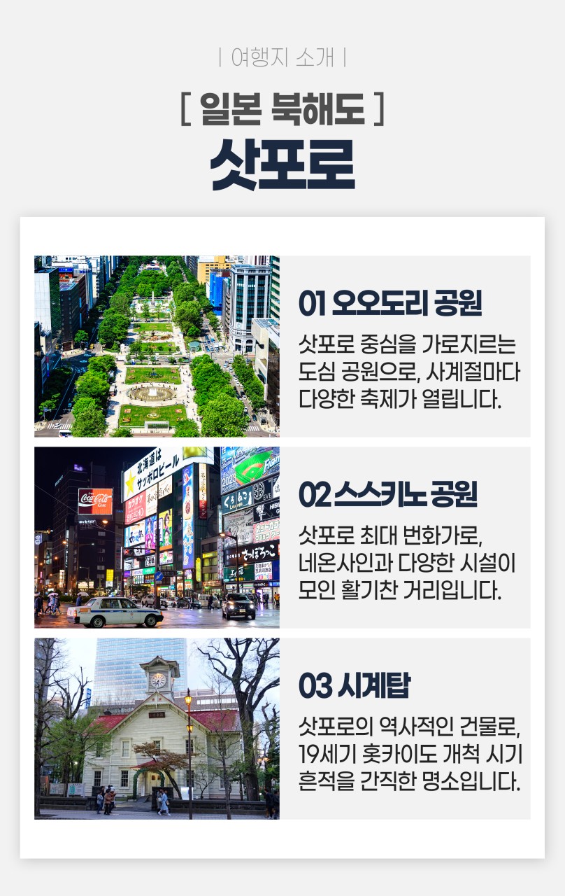 오오도리 공원에 위치한 삿포로 TV 타워는 1957년에 완공됐으며, 도쿄 타워를 설계한 '나이토 타추'가 설계한 건축물로, 높이 147.2m를 자랑하는 전파탑이자 전망대입니다.