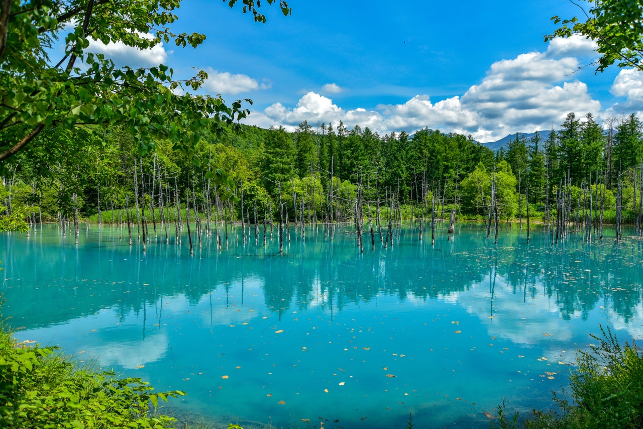 홋카이도 비에이 지역에 위치한 아오이이케는 인공적으로 조성된 방재용 보(洑)에 물이 고이면서 우연히 탄생한 **'기적의 호수'**입니다. 2012년 애플의 맥 OS 배경화면으로 채택되면서 세계적으로 유명해졌습니다.